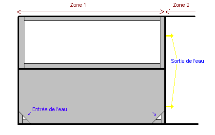 L’eau entrera par les quatre coins, et ressortira par les deux ouvertures entre la zone 1 et la zone 2.