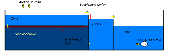 Fonctionnement : L’écoulement de l’eau dans la zone anaérobie est assuré grâce à la différence de niveau entre les zone 1 et 2. Le débit est réglé par la taille du trou dans la parois qui sépare les deux zones.