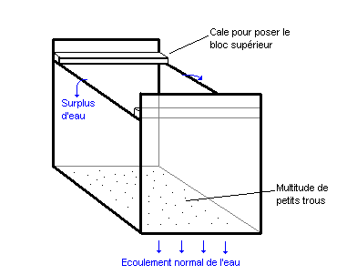 Le premier bac (celui tout en haut) est moins haut que les autres. Il ne contient pas de sable ni de ouate, son but est de répartir l’eau sur toute la surface du bac en dessous. Au centre de ce bac, ou l’eau venant de l’aquarium tombe, il ne doit pas y avoir trop de trous.